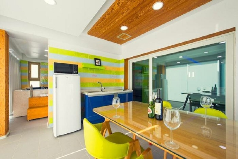 컬러풀하고 아기자기한 인테리어가 돋보이는 펜션유의 객실, 가족 여행에는 기준 인원은 2인이지만 추가 시 최대 5인까지 가능한 y02호 객실을 추천드린다. y02호는 거실과 침실이 분리되어 있어서 널찍한 사이즈를 자랑한다.