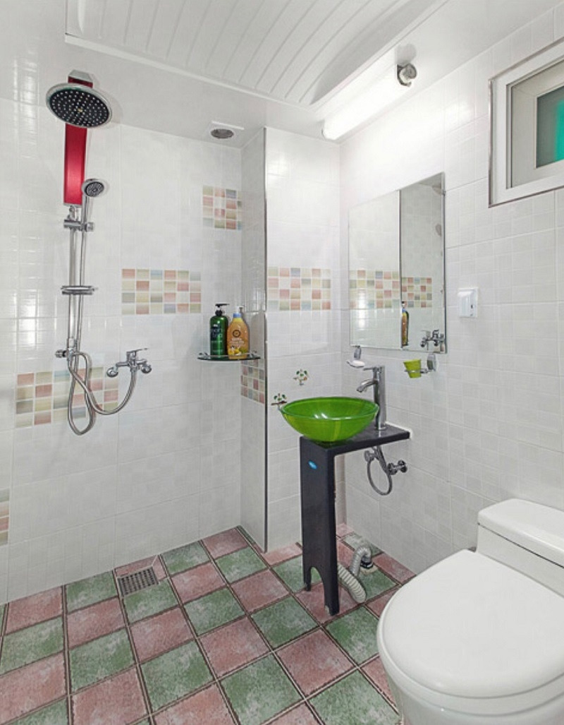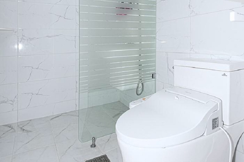 화이트톤의 깔끔한 조아라 펜션의 욕실. 샴푸와 바디워시 등 기본적인 샤워 용품이 제공된다. 치약과 칫솔은 그리고 클렌징폼은 직접 챙겨와야 한다.
