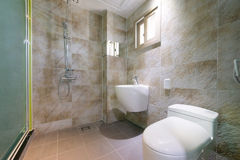 넓고 깔끔한 펜션유의 욕실. 어메니티는 인원수에 맞게끔 일회용품으로 제공된다. 샴푸, 바디워시, 칫솔, 치약 모두 제공된다.