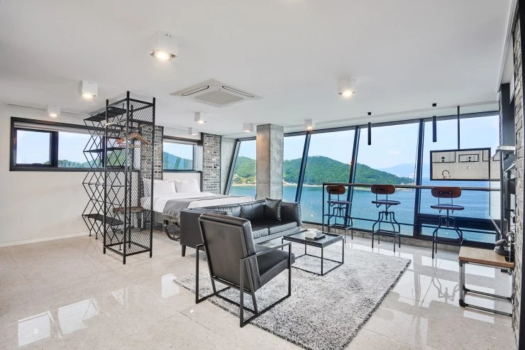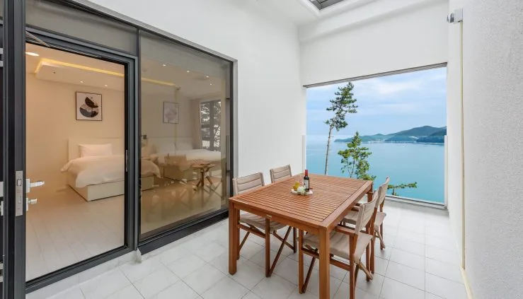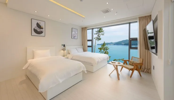 그랜드 스카이 오션뷰는 커튼 월 구조 유리벽에 놓인 침대에 누워 청명한 하늘과 바다, 다도해 일출까지 볼 수 있어 인기가 높다. 킹과 싱글 베드 각 1개, 월풀 스파, 테라스, 주방, 전용 욕실 등을 갖췄다.