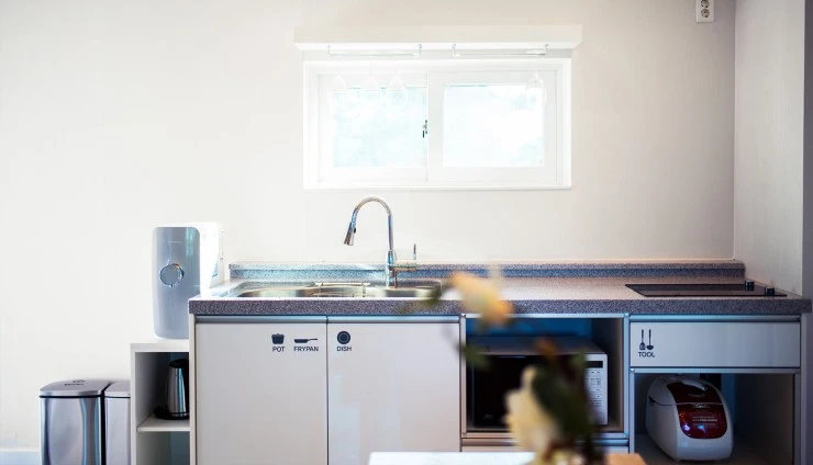 주방에는 냉장고와 전기밥솥, 전자레인지, 인덕션, 정수기, 커피포트 등 취사 도구는 물론, 와인잔까지 완비했다. 바비큐는 객실 테라스에서 프라이빗하게 즐기실 수 있다. 그릴 사용 요금은 2만 원이다.