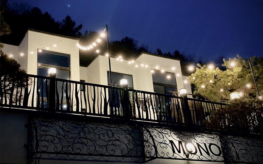 중원산 자락에 위치한 모노 펜션은 하얀 외관과 수영장, 그리고 잘 가꾸어진 정원까지 감성 돋는 모노 펜션! 특히 저녁에 조명이 켜지면 더욱 로맨틱해지니 커플 숙소로 추천한다.