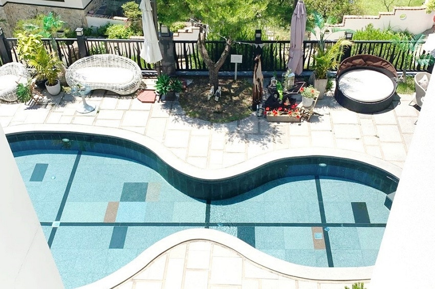 객실 테라스에서 보이는 예쁜 모노 펜션의 수영장. 물이 많이 깊지도 않고, 수질 관리도 잘 되어 있다.