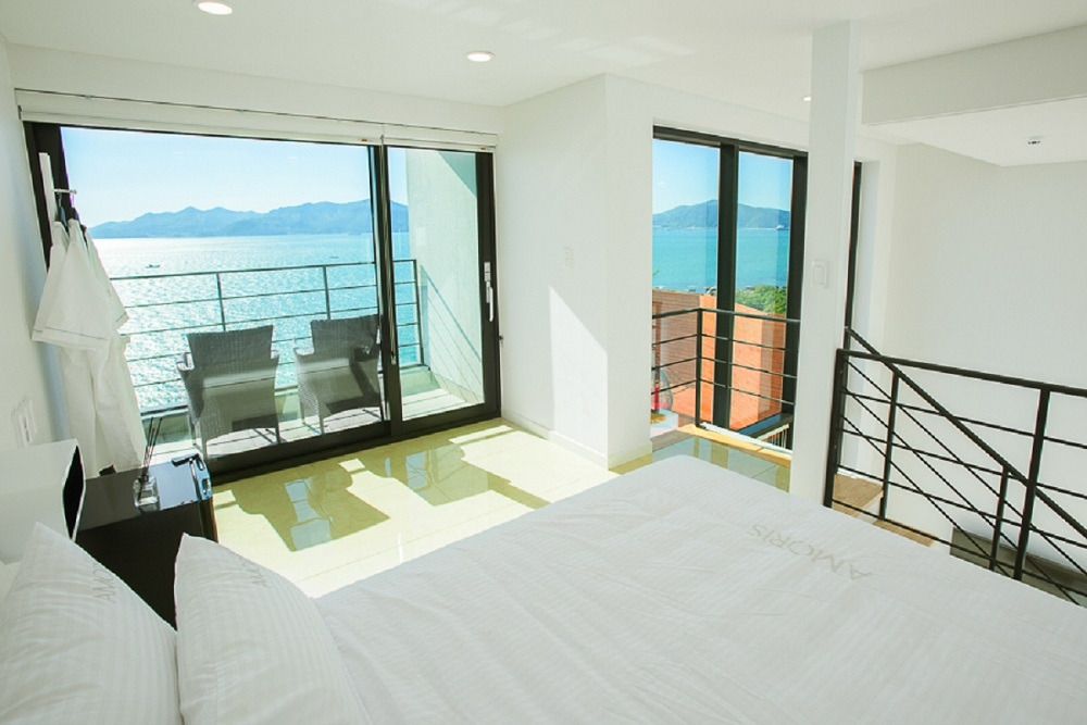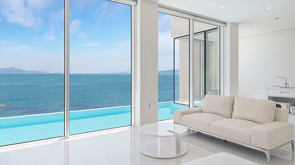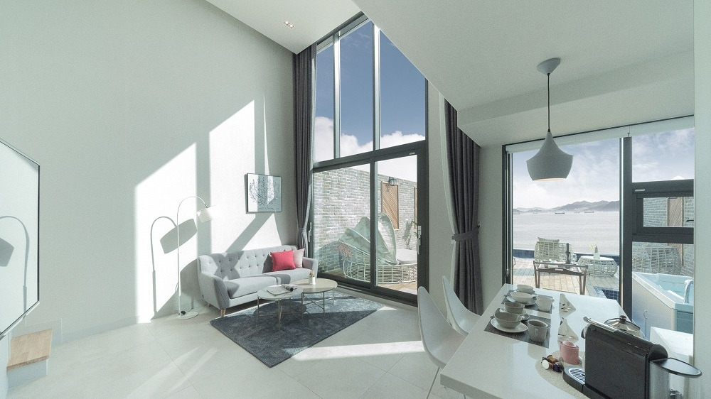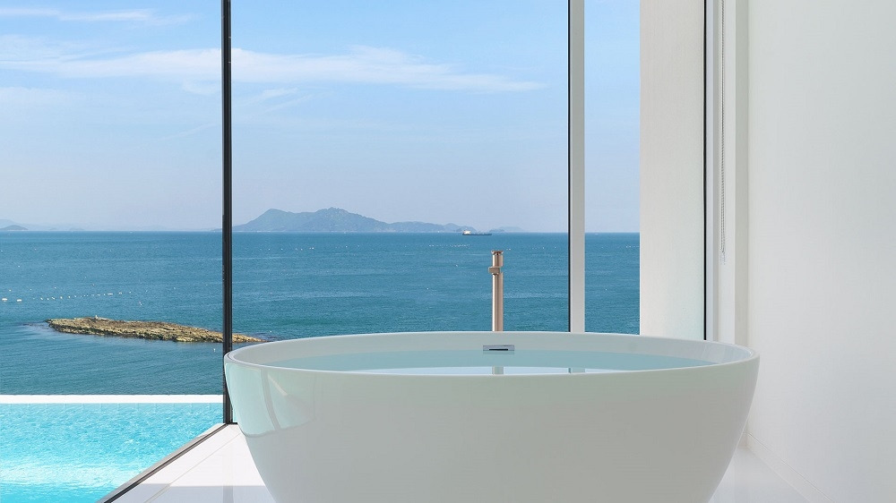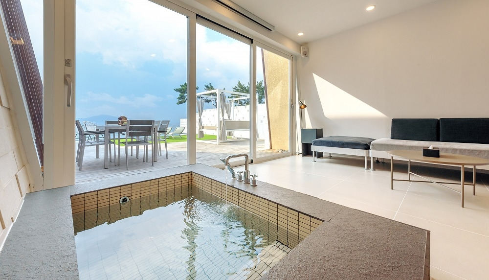 객실은 원룸형이지만 가구, 벽, 바닥까지 모두 올 화이트로 통일되어 전혀 좁아 보이지 않고, 거실 통유리창에서는 개별 인피니티풀과 남해를 한눈에 담을 수 있다.