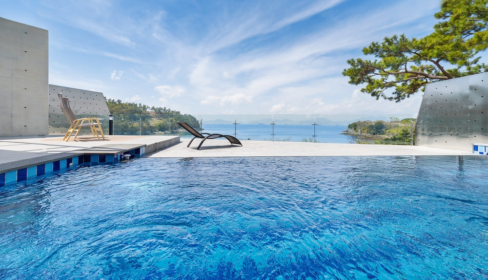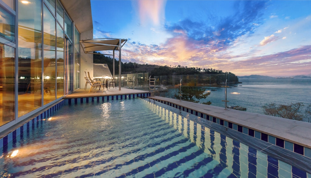 2층 전면 유리창으로 남해의 하늘과 바다를 한눈에 담을 수 있는 남해 더뷰 1151. 야외 프라이빗 테라스에서는 사계절 온수를 이용하여 따뜻하게 수영을 즐길 수 있고, 특히 남해안 해수를 이용하기 때문에 천연성분이니 피부에도 더 안심하고 즐길 수 있다.