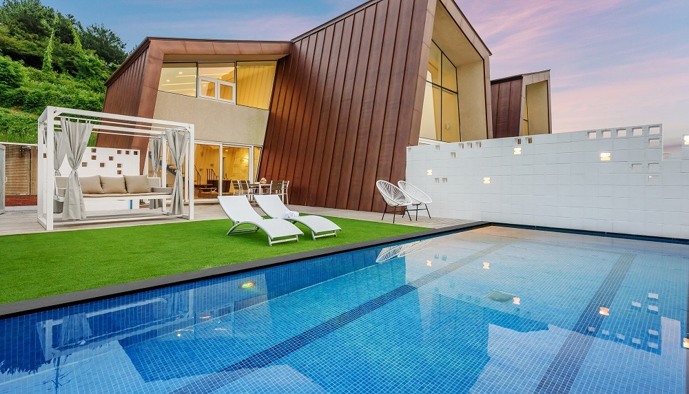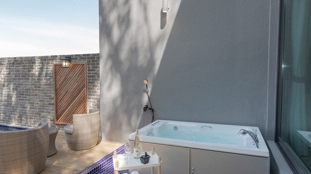 객실의 야외 테라스에는 7m 크기의 인피니티풀이 있어서 프라이빗하게 물놀이를 즐길 수 있고, 수영장은 약 30도의 미온수로 운영되기 때문에 계절과 날씨에 상관없이 이용 가능하다. 그뿐만 아니라 수영장 옆에는 노천스파와 전기 그릴 바비큐장이 준비되어 있다.