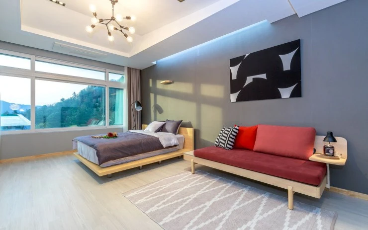 초록초록한 주변 경관과 어우러져 하얀색 독채형 객실이 그림같이 자리하고 있다. 지붕부터 벽면, 내부까지 모두 화이트톤으로 맞춰서 군더더기 없이 깔끔하다. 공간마다 다르게 사용한 조명으로 한층 고급스럽다.