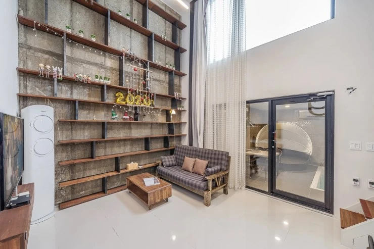 풀빌라 202호 객실은 로맨틱한 휴양을 원하는 커플에게 인기가 높다. 복층 구조로 1층에는 거실, 주방, 화장실, 수영장, 테라스, BBQ 시설을 갖췄다. 침실은 2층에 있습니다. 퀸사이즈 침대를 구비했다.