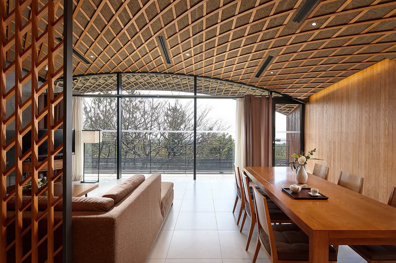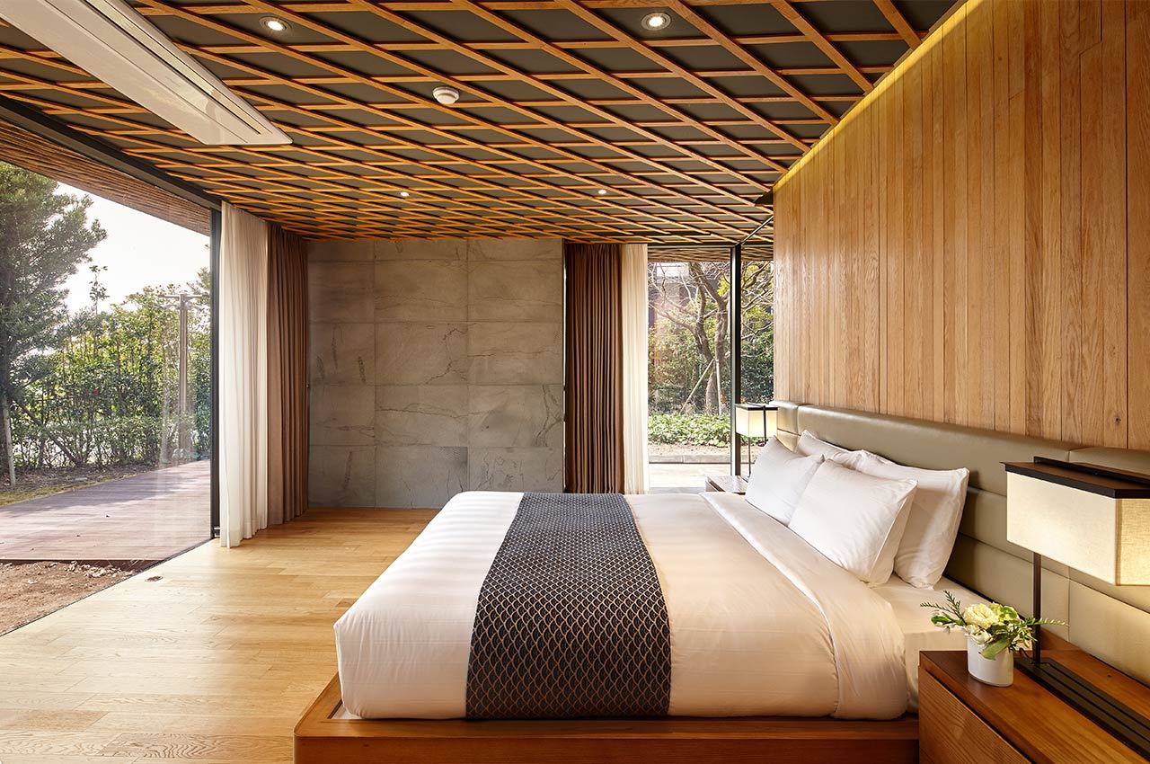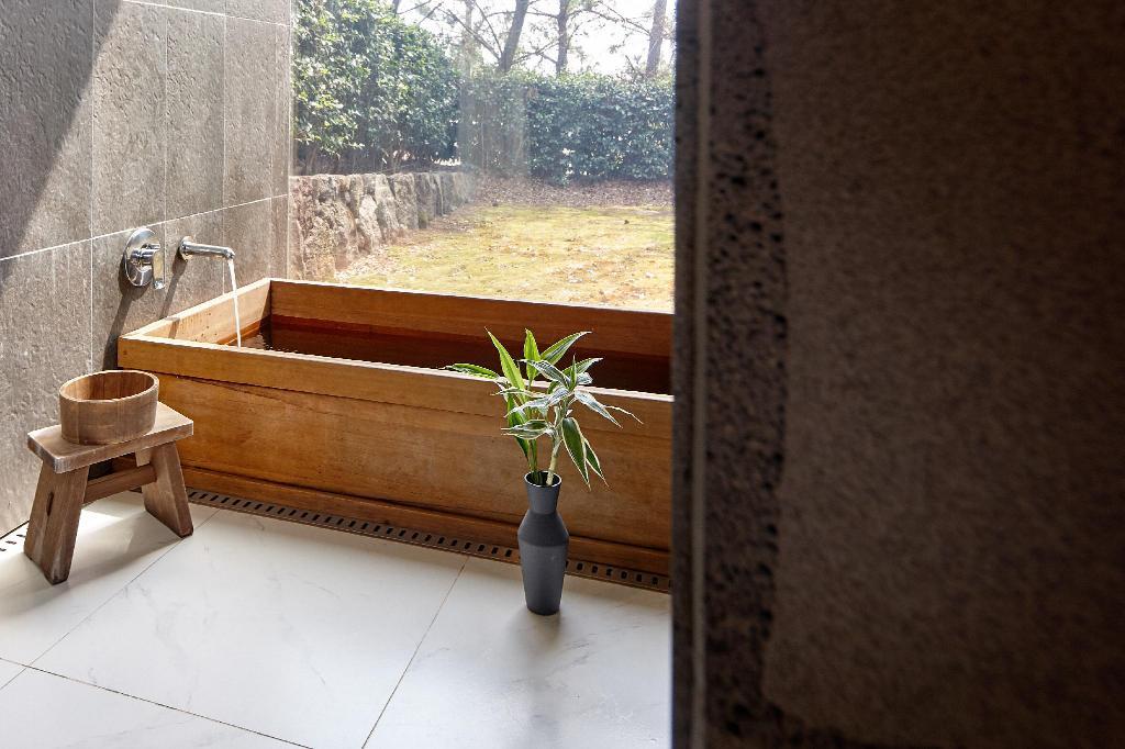 1층과 2층으로 나뉘어진 내부는 전체적으로 편백나무로 마감되어 일본 건축물 특유의 편안함과 섬세함이 돋보인다. 1층에는 2개의 침실이 준비되어 있고, 실내 히노키탕도 준비되어 있어서 날씨에 상관없이 창밖의 풍경을 감상하며 반신욕 즐길 수 있다.
