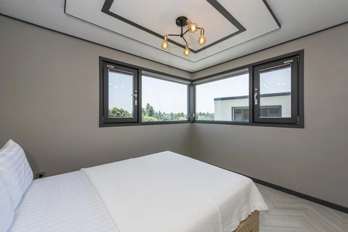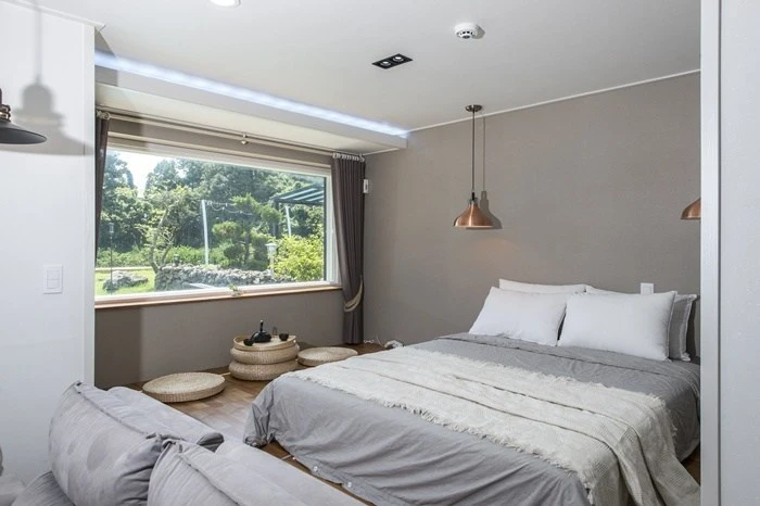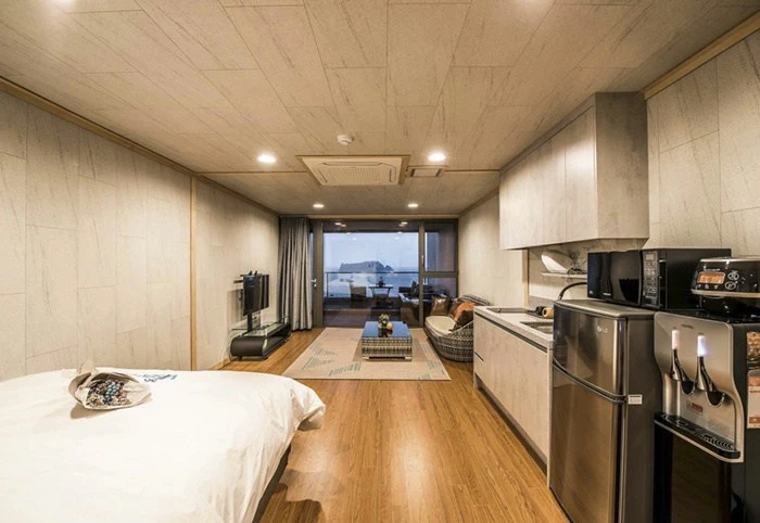 원룸 형태의 객실은 침실과 거실 겸 주방으로 구성되어 있다. 침대는 최고등급 에이스 매트리스와 구스침구로 편안한 잠자리를 보장한다. 주방에서는 간단한 취사가 가능하며 취사도구와 식기, 냉온정수기가 갖춰져 있다. 객실 내 모든 창문과 도어는 무소음 알미늄시스템 창호로 되어 있어 프라이빗한 휴식을 취할 수 있다.