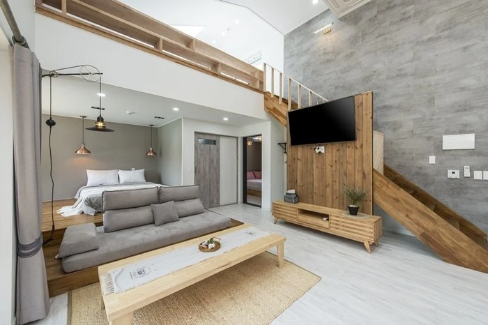 더썸플러스 풀빌라는 거실이 2개, 침실이 무려 4개, 욕실도 3개나 있는 60평대의 초럭셔리 독채펜션이여서, 플렉스라는 단어가 어울리는 숙소이다. 편백나무로 마감되어 편안한 분위기가 가득하며, 객실 조망도 훌륭하다.