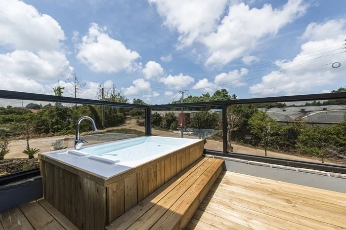 바다가 내려다 보이는 오션뷰 수영장은 마치 해외 리조트에 온 것 같다. 천연 히노끼 수영장으로 운영되고 있으며, 썬베드도 잘 갖춰져있어 휴양을 원하는 분들에게 완벽한 휴식을 선물한다.