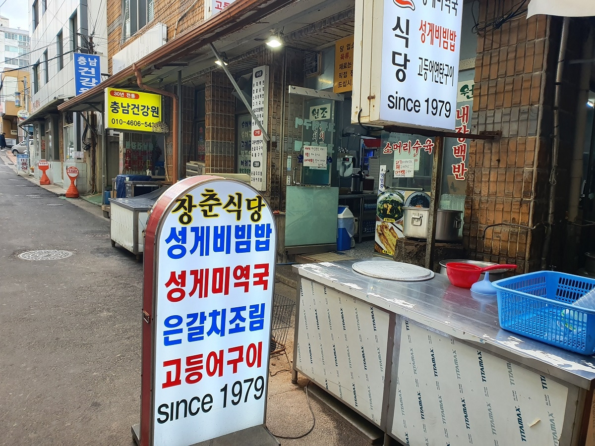 다음으로 소개해 드릴 곳은 동문시장의 오랜 역사를 자랑하는 맛집 ‘장춘식당’으로 1979년부터 모든 재료를 손수 만든 국내산 재료를 고집하여 싱싱하고 푸짐한 제주 향토음식을 판매하고 있다. 특히 갈치조림, 성게 미역국이 그렇게 맛있다고 한다. 아침 08:00~20:00까지 영업하니 이곳도 아침 비행기여도 밥 먹고 공항 가기 딱 좋다.
