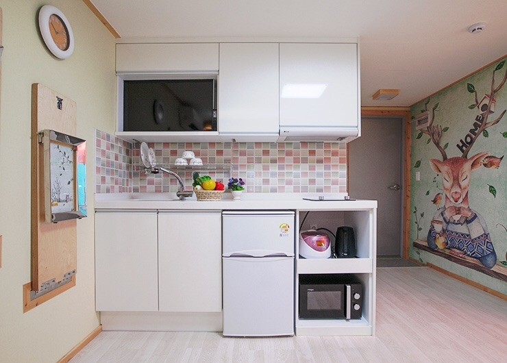 인덕션, 싱크대, 냉장고, 전자레인지는 물론, 냄비, 후라이팬, 각종 식기류 일체가 준비되어 있다. 공용 개수대까지 갈 필요 없이, 객실에서 간단히 준비하고 객실 바로 앞에서 프라이빗 바비큐를 즐길 수 있어서 편리하다.