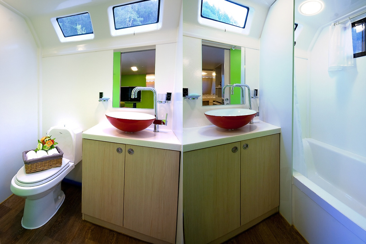 세면대, 화장실 그리고 무려 욕조가 준비되어 있어다. 샤워 커튼까지 설치돼 있으니 물 넘칠 걱정 없이 쾌적하게 이용할 수 있다. 세면용품으로 샴푸, 린스, 바디샴푸, 비누가 제공된다. 단 수건과 칫솔 세트 등은 준비되지 않으니 개인적으로 챙겨와야 한다.