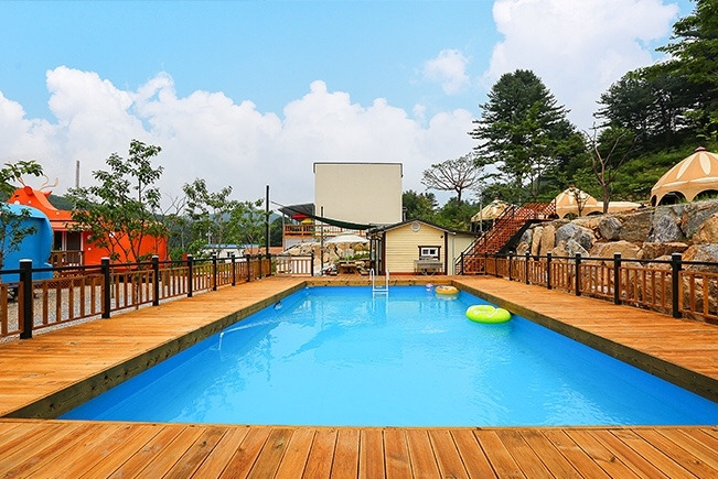 체크인 오후 3시부터, 체크아웃은 오전 11시까지 하면 된다! 부대시설로는 야외 수영장은 물론 족구장, 골프 연습장, 매점 등 다양한 즐길 거리가 준비되어 있다.