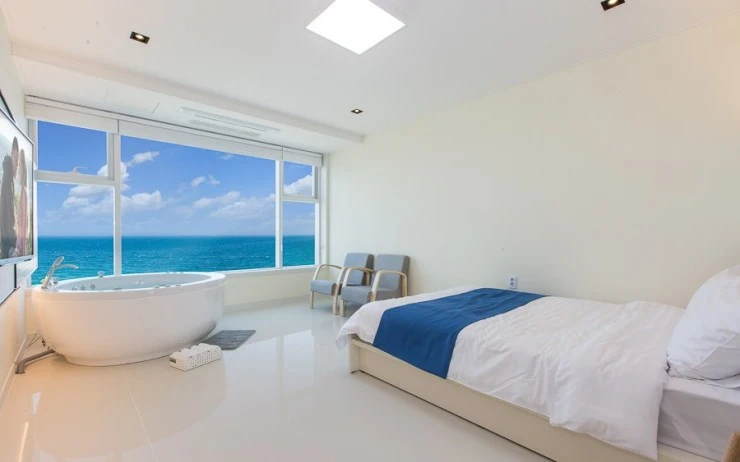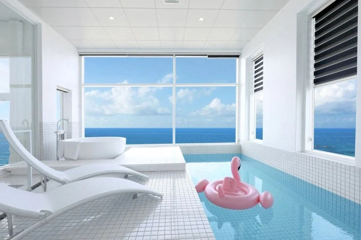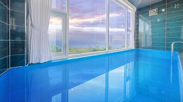 깔끔하고 모던한 인테리어가 인상적이며, 언택트 여행이 대세인 요즘 상황에 맞게 전 객실 내에 사계절 이용 가능한 개별 온수 수영장이 갖춰져 있다. 수영장 규모도 큰 편이라 충분히 물놀이를 즐길 수 있다. 온수 추가 요금이 없다는 점도 큰 메리트!