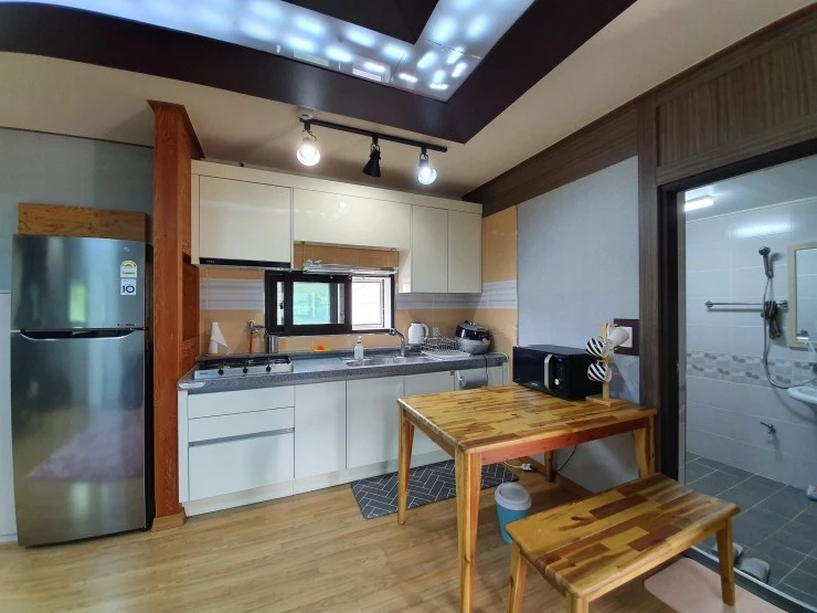 1층은 거실 겸 주방으로 취사가 가능하며 조리도구가 준비되어 있다. 복층은 침대룸과 온돌룸이 하나씩 마련되어 있다.