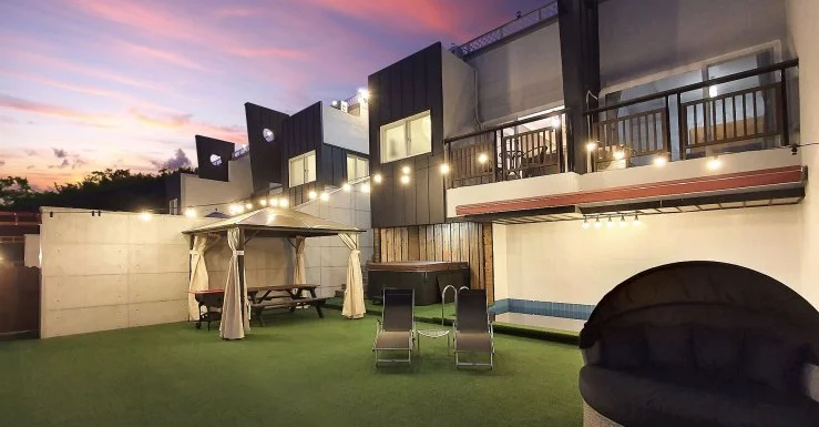 남해 오션하임풀빌라의 테라스는 다른 개별 테라스와는 격이 다른 클래스를 자랑한다. 무려 26평의 초대형 테라스에서는 바비큐 시설과 7인용 대형 월풀스파, 개별 수영장을 여유롭게 이용할 수 있다.
