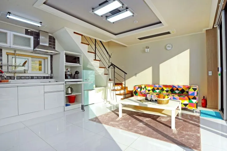 거실 겸 주방인 1층에는 취사를 위한 조리도구와 커피머신이 갖춰져 있어 편리하다. 넉넉한 면적의 복층은 침실로 편안한 휴식을 취할 수 있다.