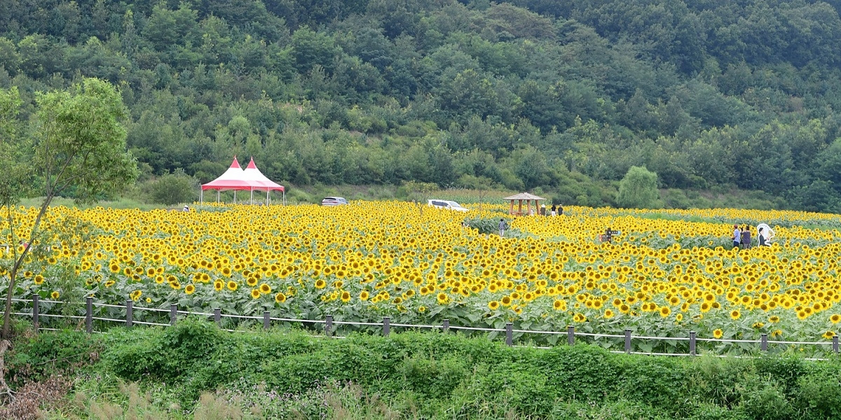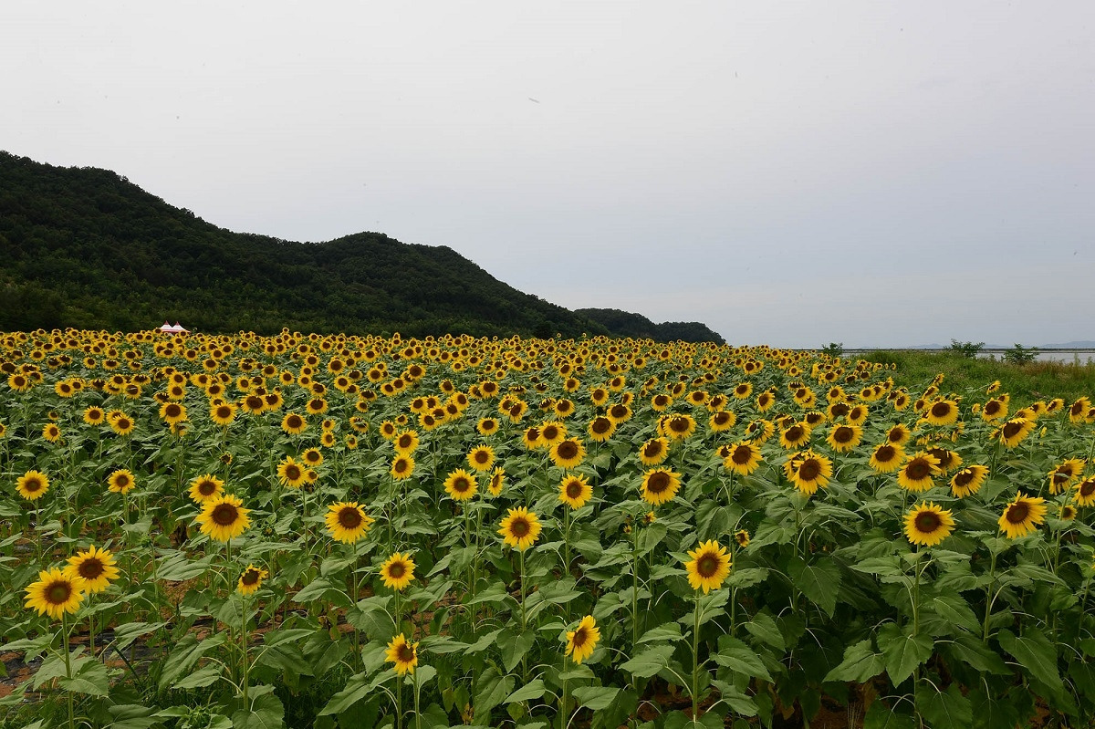약 100세대가 사는 강화도 교동의 작은 마을인 난정리. 마을 주민들이 마을에 활력을 불어넣고자 직접 1만여 평에 노란 해바라기를 직접 심고 가꾸어 빠르면 8월 중순부터 꽃이 펴 추석 즈음이면 만개한 해바라기 꽃밭을 볼 수 있다.