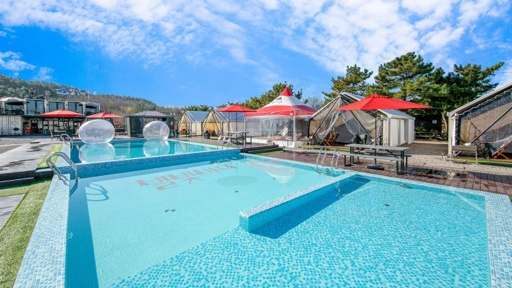 태안 학암포 별빛바다 글램핑 객실은 야외 수영장 중심으로 배치돼 있다. 객실 타입은 글램핑, 펜션, 컨테이너 하우스로 취향에 따라 고르면 된다. 각 룸마다 천장에 창이 설치돼 있어, 가을밤 하늘을 만끽하기 좋다.