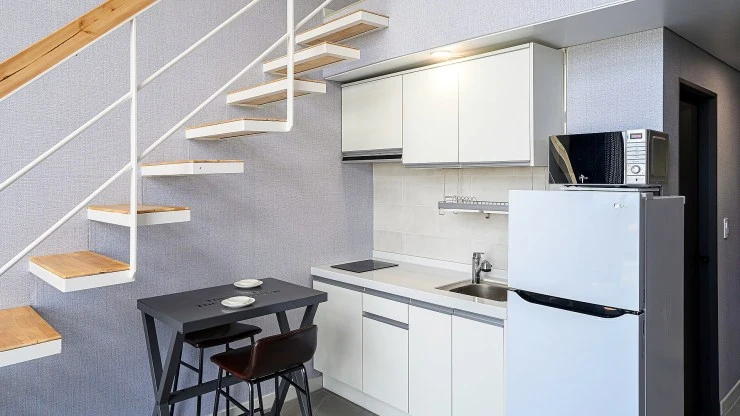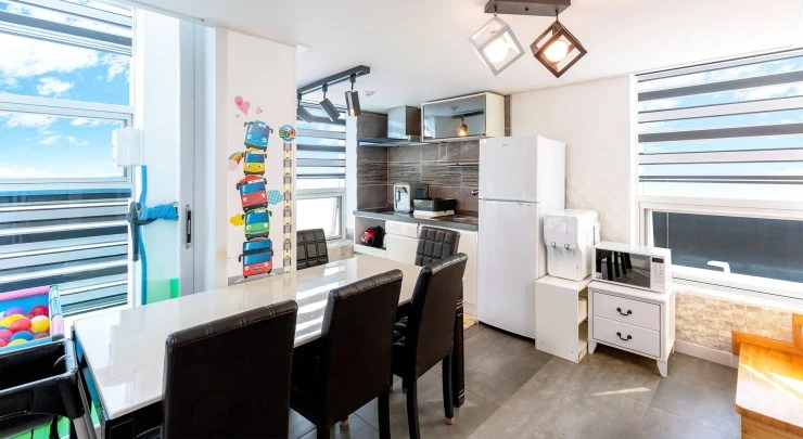 주방 시설은 객실마다 다릅니다. A 402호 기준으로 냉장고와 식탁, 정수기, 전자레인지, 커피포트, 젖병 소독기 등을 구비했다. 객실 내에서 바비큐를 이용하고 싶다면, 원적외선 전기 그릴(자이글)을 빌릴 수 있다.