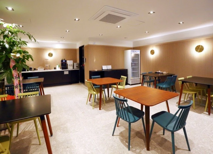 2층 카페에서는 커피와 와인을 즐길 수 있다. 맥주와 간단한 스낵, 라면 등을 구비한 자동판매기도 있어 친구들과 야식을 먹기에도 딱이다. 체크인은 15시부터 가능하며 체크아웃은 12시까지이다.