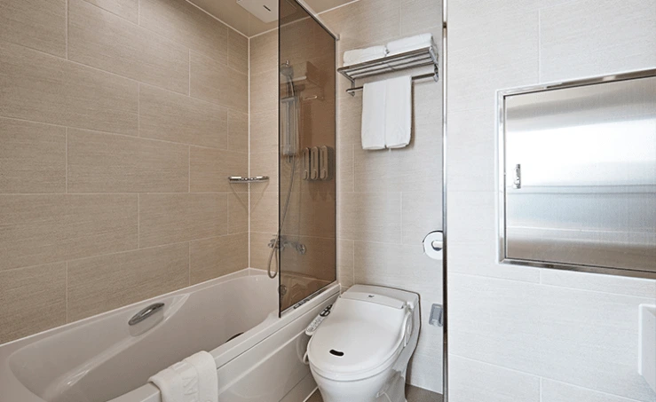 요즘 대세는 친환경이죠. 이에 맞춰, 해운대 라비드 아틀란 호텔 욕실에도 샴푸와 컨디셔너, 바디워시가 디스펜서로 제공된다. 이외 샤워캡과 헤어밴드, 화장솜, 면봉, 빗, 헤어드라이어 등을 준비해 준다.