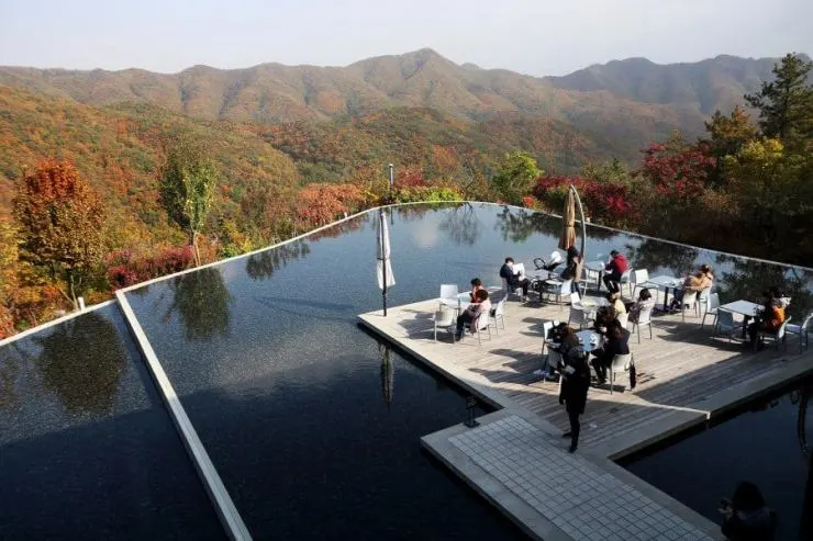 원주하면 빼놓을 수 없는 뮤지엄 산에서도 예쁜 단풍을 만날 수 있다. 가장 인기있는 포토스팟은 카페 테라스! 아름다운 반영과 울긋불긋하게 물든 능선을 보기 좋다.