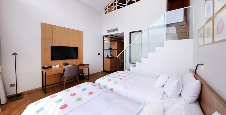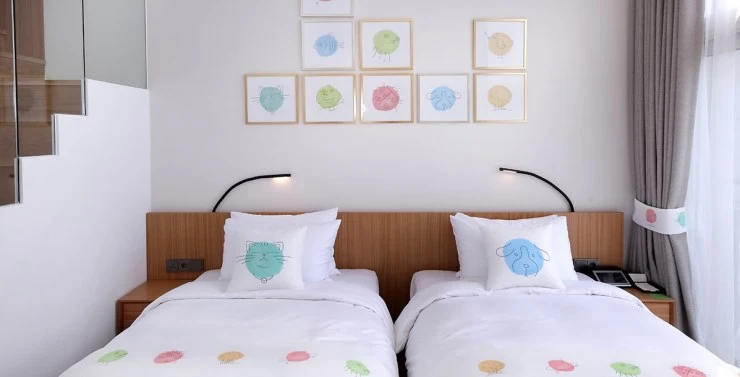 프리미어 캐릭터는 밝고 화사한 분위기로 아이들과 함께 머무르기 좋은 객실이다. 발받침, 캐릭터 쿠션, 낮잠 이불 등 어린이 용품이 구비되어 있어 키캉스 즐기기 딱이다. 이 객실은 미니바(스낵, 주스)도 1회 무료로 이용할 수 있다.