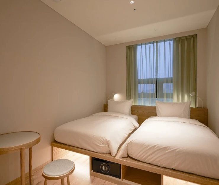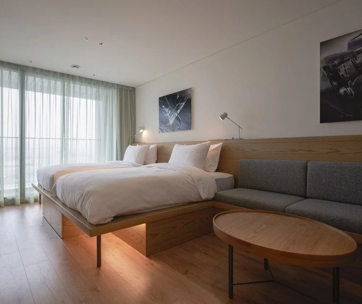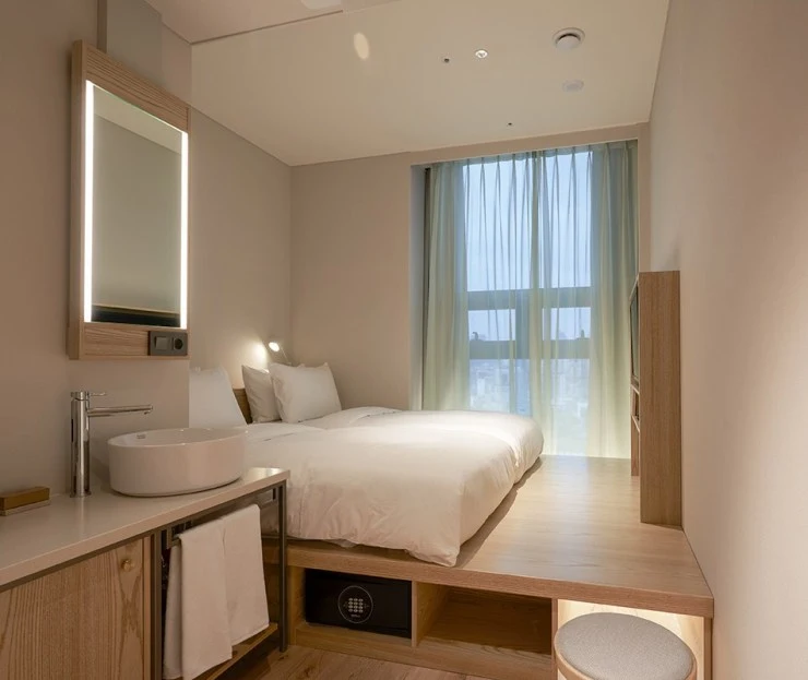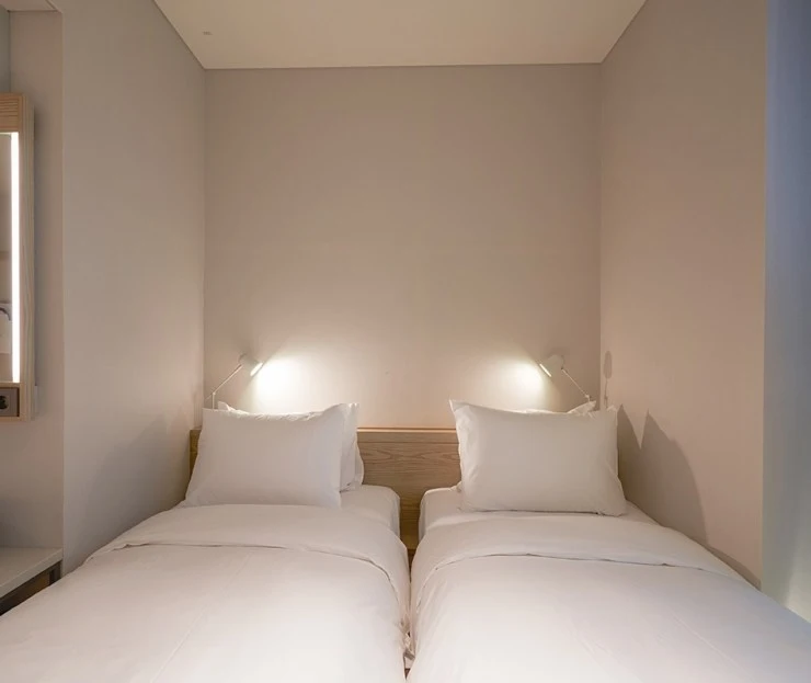 호텔 안테룸 서울의 스튜디오 B 객실은 트윈베드가 놓여있는 2인실이다. 가로수길에 위치한 만큼 객실 면적은 좁지만, 효율성을 최대로 끌어낸 가구 배치로 머무는데 불편함이 없다. 우드톤의 코지한 인테리어도 편안한 분위기를 이끌어낸다.