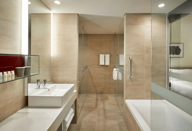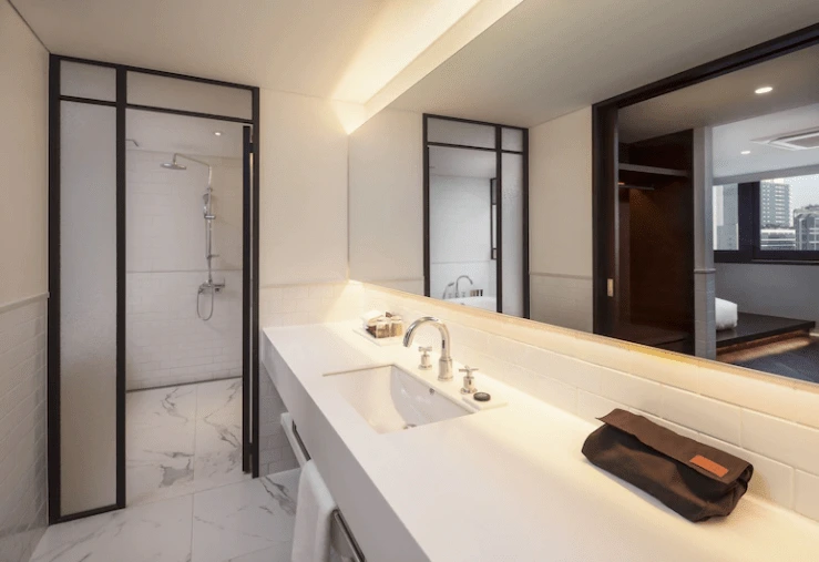 욕실 어메니티로 샴푸와 컨디셔너, 바디워시가 리필형 용기로 제공된다. 개인 위생용품으로는 칫솔과 치약, 면도기, 샤워 타올, 면봉, 머리끈, 화장솜이 준비돼 있다. 폼클렌징, 여성 청결제도 비치해 놨다.