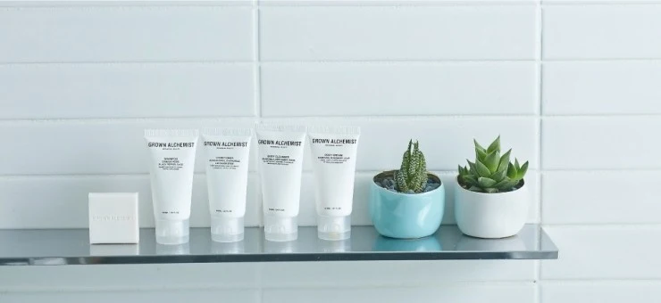 어메니티로는 Grown Alchemist의 목욕 용품과 바디로션, 비누가 준비된다. 그외 일회용품으로는 샤워볼, 칫솔세트, 면봉, 화장솜, 입욕제, 수건 등 제공된다.