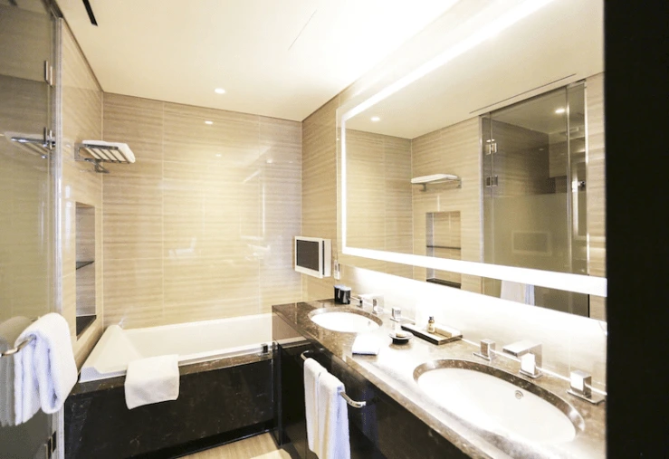 투 베드룸 욕실에는 스팀 사우나 시설을 완비했다. 욕실용품으로는 샴푸와 컨디셔너, 바디워시, 바디로션, 비누가 제공된다. 칫솔은 따로 챙겨와야 해요. 깜박했다면, 프런트에 요청하면 된다.