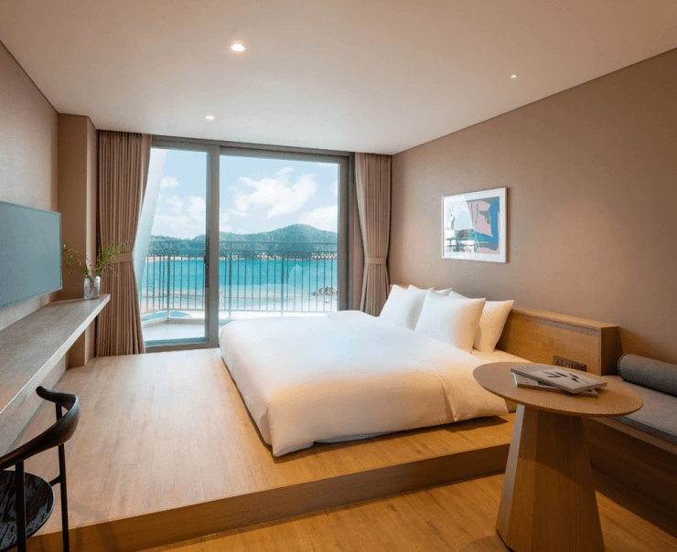 아이와 함께인 가족 호캉스족에게 사랑받는 더위크앤리조트 객실이다. 더블베드룸과 키즈룸으로 구성됐다. 키즈룸에는 전용 메트리스와 텐트가 설치돼 있다. 테라스 밖으로는 산과 바다가 어우러진 풍경이 보인다.