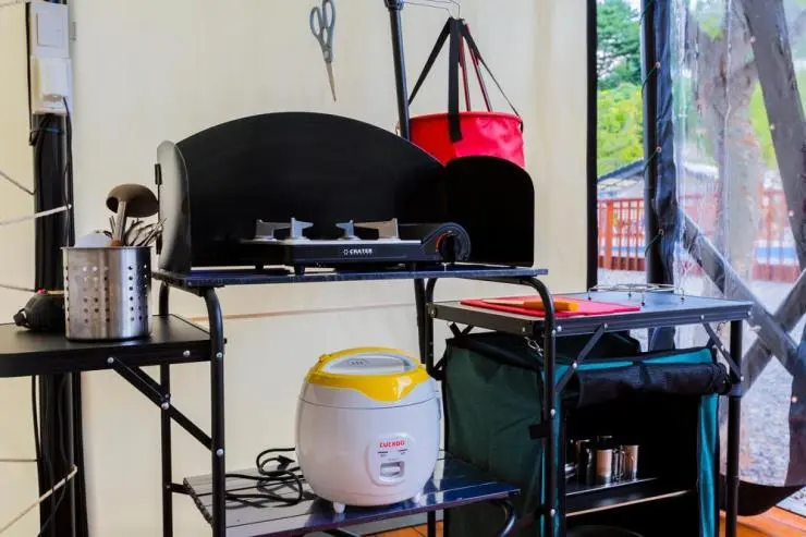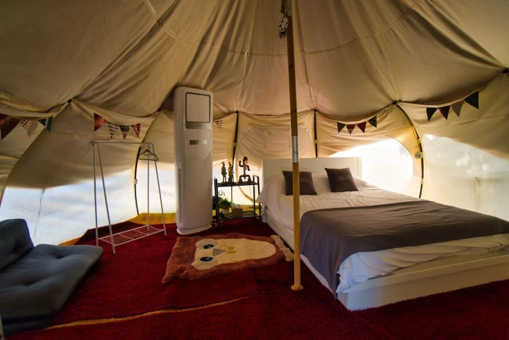 키세스 초콜릿 모양의 귀여운 텐트와 내부는 엄청나게 넓은 공간으로 침대, 에어컨, 소파 등 편의시설을 모두 갖추고 있다.