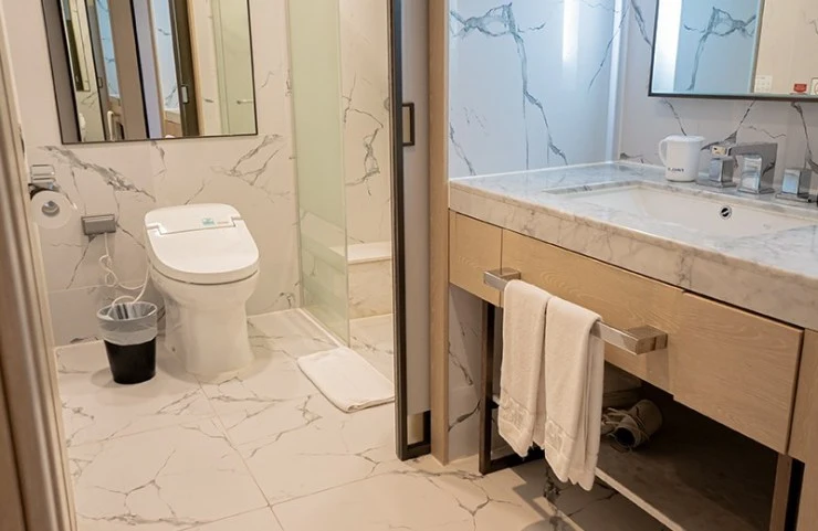 욕실도 깔끔하고 쾌적하게 관리되고 있다. 어메니티는 샴푸, 컨디셔너, 바디워시, 핸드워시가 친환경 다회용 제품으로 제공된다. 칫솔과 치약 등 일회용 어메니티는 별도로 구매 가능하다.