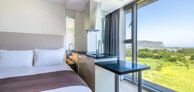 널찍하고 고급스러운 객실 인테리어와 간이 주방까지 마련돼 편리하고 성산 일출봉을 조망할 수 있어 유명한 제주 성산 숙소! 부대 시설로 수영장을 운영하고 있어 가족 여행 숙소로도 특히 인기가 좋다.