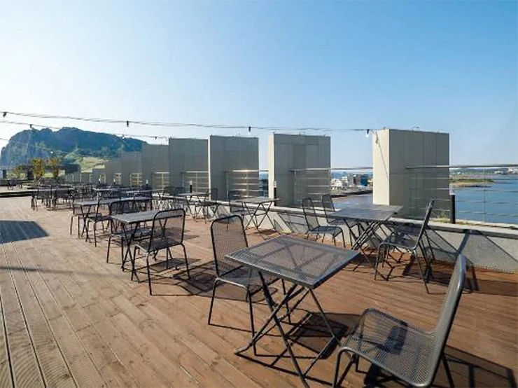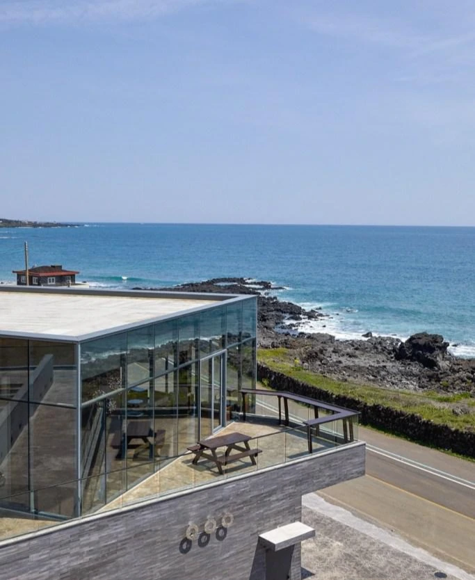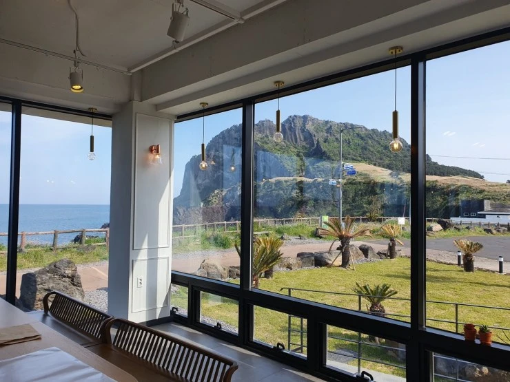 올라가자마자 탁 트인 통유리 창가 너머 사방으로 해안도로와 잔잔한 제주 바다를 감상할 수 있다. 그뿐만 아니라 야외 테라스 좌석도 준비되어 있다! 날씨가 좋고, 운 좋으면 돌고래도 볼 수 있다니! 테라스 자리 꼭 기억해뒀다가 방문해보자.