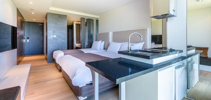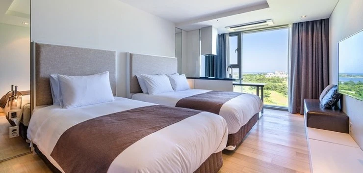 성산 일출봉과 바다가 보이는 탁 트인 전망으로 유명한 제주 성산 숙소 ! 브라운 스위트 제주 호텔 앤 리조트의 디럭스 트윈 객실. 널찍한 객실에는 트윈 베드와 간이 주방이 준비되어 있어 전망뿐만 아니라 편안히 머물기 좋은 곳이에요.