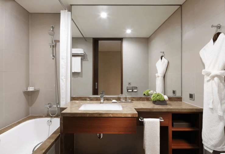 울산 호텔 리버사이드 욕실에는 비데가 설치돼 있다. 어메니티로는 샴푸와 컨디셔너, 샤워젤, 바디워시, 비누가 제공된다. 이외 칫솔과 치약, 빗, 샤워캡, 면봉, 샤워가운, 헤어드라이어, 수건 등을 갖췄다.