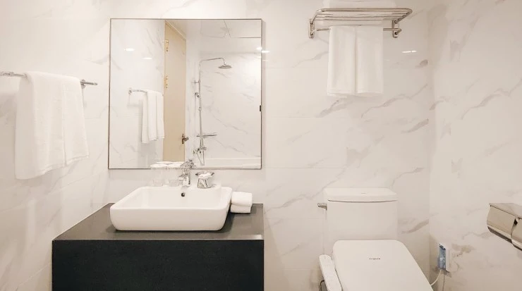화이트 톤의 욕실도 깔끔하게 관리되고 있어요. 샴푸, 컨디셔너, 바디워시, 바디로션, 칫솔, 치약 등이 어메니티로 구비 되어 있다.