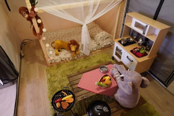 오렌지 글램핑에는 키즈 전용 객실도 있다. 키즈 침대와 주방놀이, 캠핑놀이 등 다양한 놀이기구가 갖춰져 있어 아이들과 키캉스 즐기기에도 좋은 가평 글램핑이다.