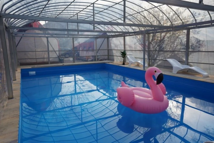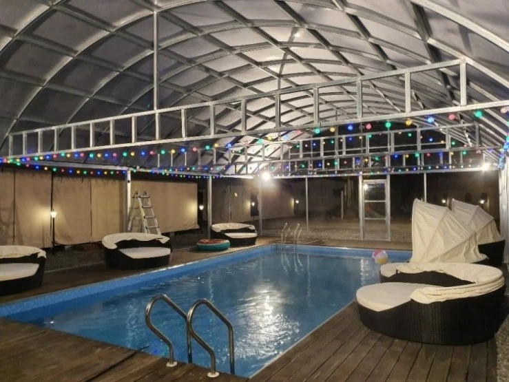 핀란드 캠핑성에는 사계절 사용 가능한 돔 온수 수영장도 있다. 15:00 ~ 20:00 에 이용 가능하다. 선베드도 넉넉히 있어 편안한 시간을 보낼 수 있다.
