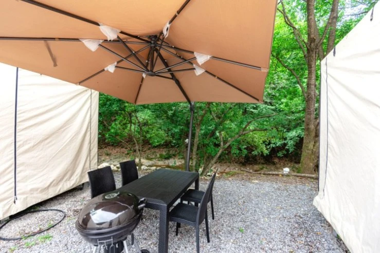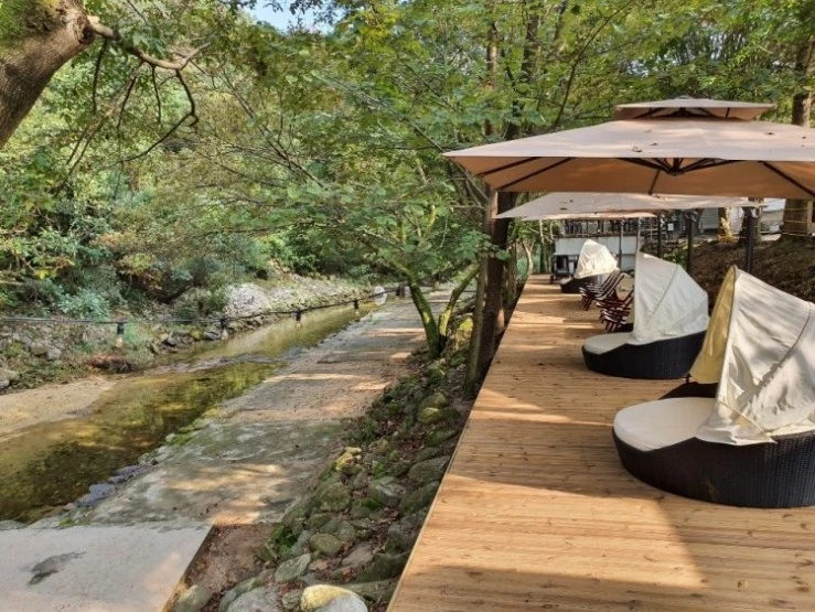 글램핑장 바로 앞에 맑고 깨끗한 계곡도 있다. 여름엔 계곡을 즐길 수 있게 야외 의자도 비치되어 있어 가평 핫플레이스 카페 못지 않다.