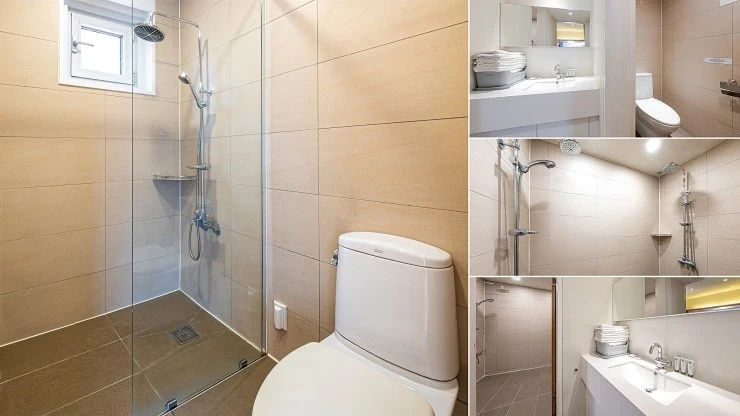 화이트 톤의 깔끔한 생각속의 집 욕실은 1층과 2층 모두 준비돼 있는데, 어메니티로는 샴푸, 컨디셔너, 바디워시, 치약, 수건, 헤어드라이어 등 제공된다.