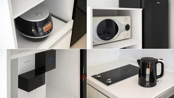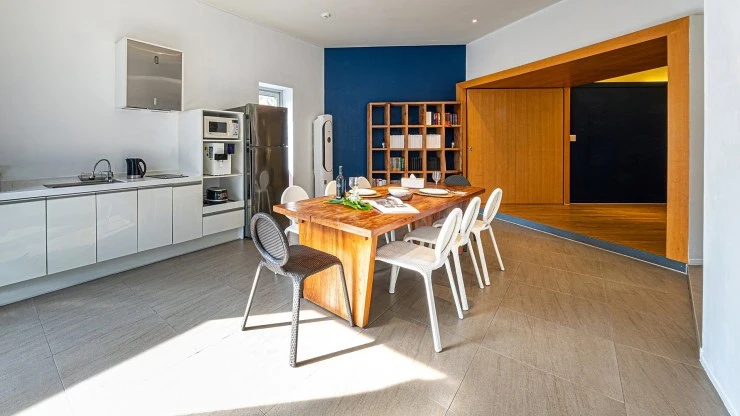 카모마일 객실 주방은 1층에 마련되어 있다. 냉장고와 원목 식탁, 싱크대, 전기쿡탑, 전기밥솥, 정수기, 전자레인지 등을 갖추어 내 집만큼 편안하게 머물 수 있다. 그뿐만이 아니라 테라스에는 개별 바비큐 공간이 준비되어 있다.