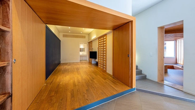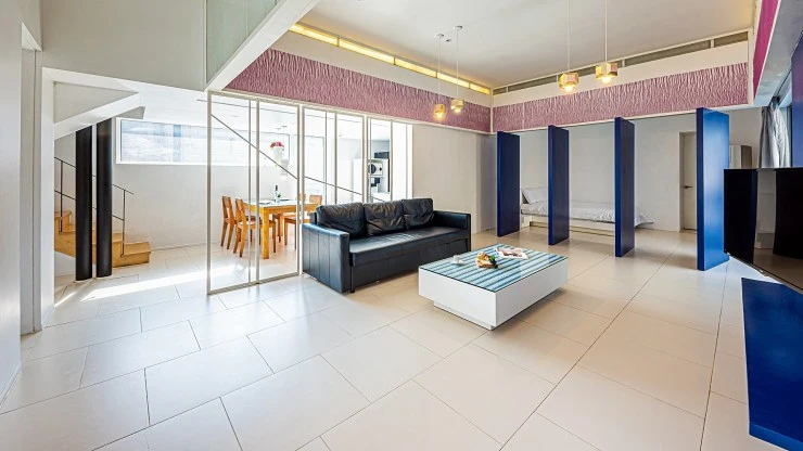 우드와 블루 컬러 조화가 돋보이는 모던한 인테리어의 양평 생각 속의 집 카모마일 객실은 복층으로 구성돼 1층에는 한실, 2층은 침실로 더블 침대 2개가 놓여 있다. 넉넉한 공간에서 숙면을 취할 수 있다.