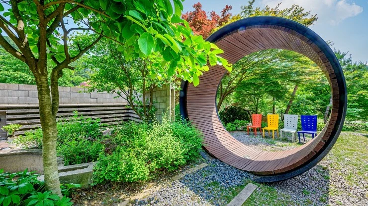 양평 숲속에 자리 잡아 고요한 휴식을 즐길 수 있는 생각 속의 집은 회색 담벼락으로 모던하며 독특한 구조의 외관으로 각종 건축상을 받았다. 내부로 들어서면 초록빛 정원이 대조되는 매력을 느낄 수 있는 곳이다.